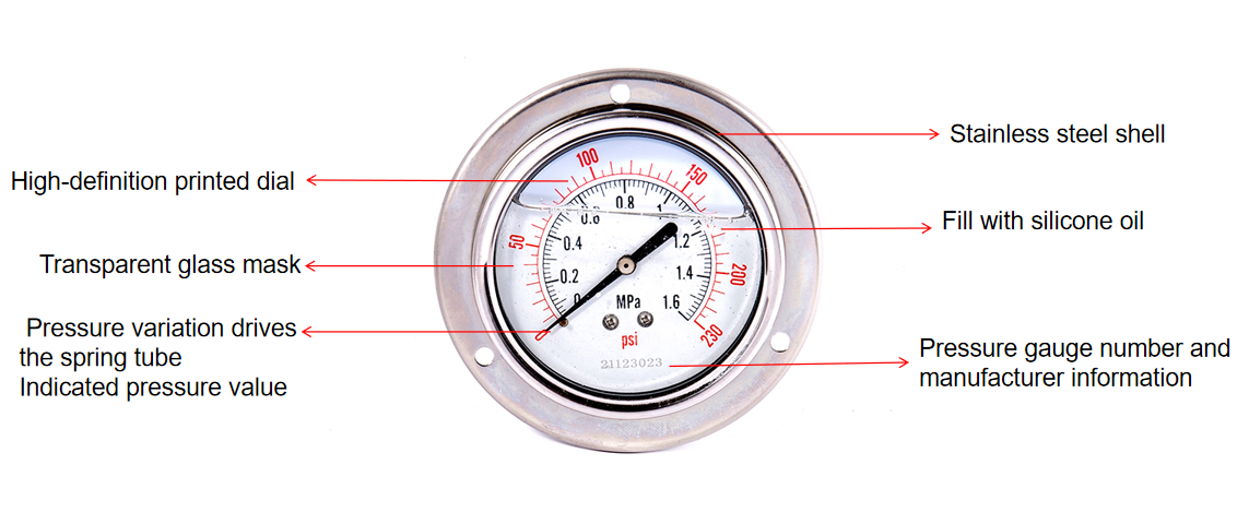 · Se voidaan määrittää painetestin avulla. Nosta hitaasti painemittarin painetta ja tarkkaile, jos osoitin palaa nolla -asentoon. Jos osoitin käyttäytyy epänormaalisti paineen nousun aikana tai jos osoitin ei palaa nollaan paineen vapautumisen jälkeen, se osoittaa, että jousiputki on vaurioitunut ja uusi painetta kantava komponentti on vaihdettava. Sen pitäisi olla poissa korkean lämpötilan lähteistä ja syövyttävistä välineistä. Jos asennusympäristö on heikko, asennusolosuhteita on parannettava.