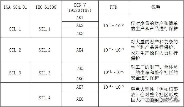 IEC-standardin mukaan se on jaettu SIL1-SIL4: een matalasta korkeaan, SIL1-SIL3: een ISA 84.01: stä ja AK1-AI8: sta matalasta korkeaan DIN V VDE0804: n mukaan. Vastaava suhde niiden välillä on seuraava.